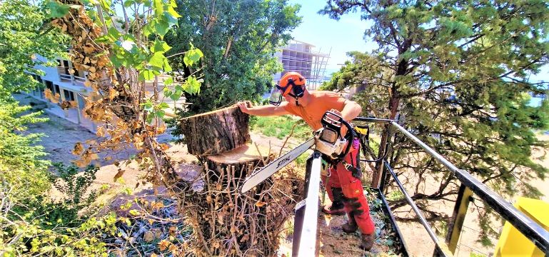 Fakivágás alpintechnikával – emelőkosaras daruval – fadöntés – tuskómarás – fakivágási engedély – Zánka.